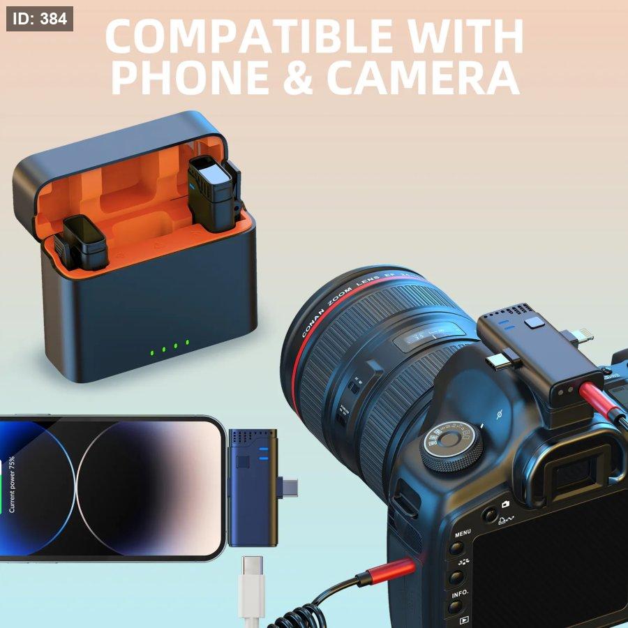 Dual-mic setup with one charging case—80 mAh per mic (≈6 hr runtime), 800 mAh case (≈42 hr)