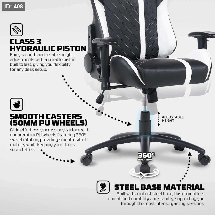 وسادة أسفل الظهر قابلة للفصل آلية الفراشة مكبس هيدروليكي من الفئة 3 عجلات ناعمة (عجلات بولي يوريثين 50 مم) قاعدة فولاذية مسند ذراع ثنائي الأبعاد وسادة رأس قابلة للفصل سطح من جلد البولي فينيل كلوريد المقاوم للماء وسادة إسفنجية مقطوعة لدعم هيكل العمود الفقري حركة دوارة 360 درجة إمالة مريحة بزاوية 180 درجة