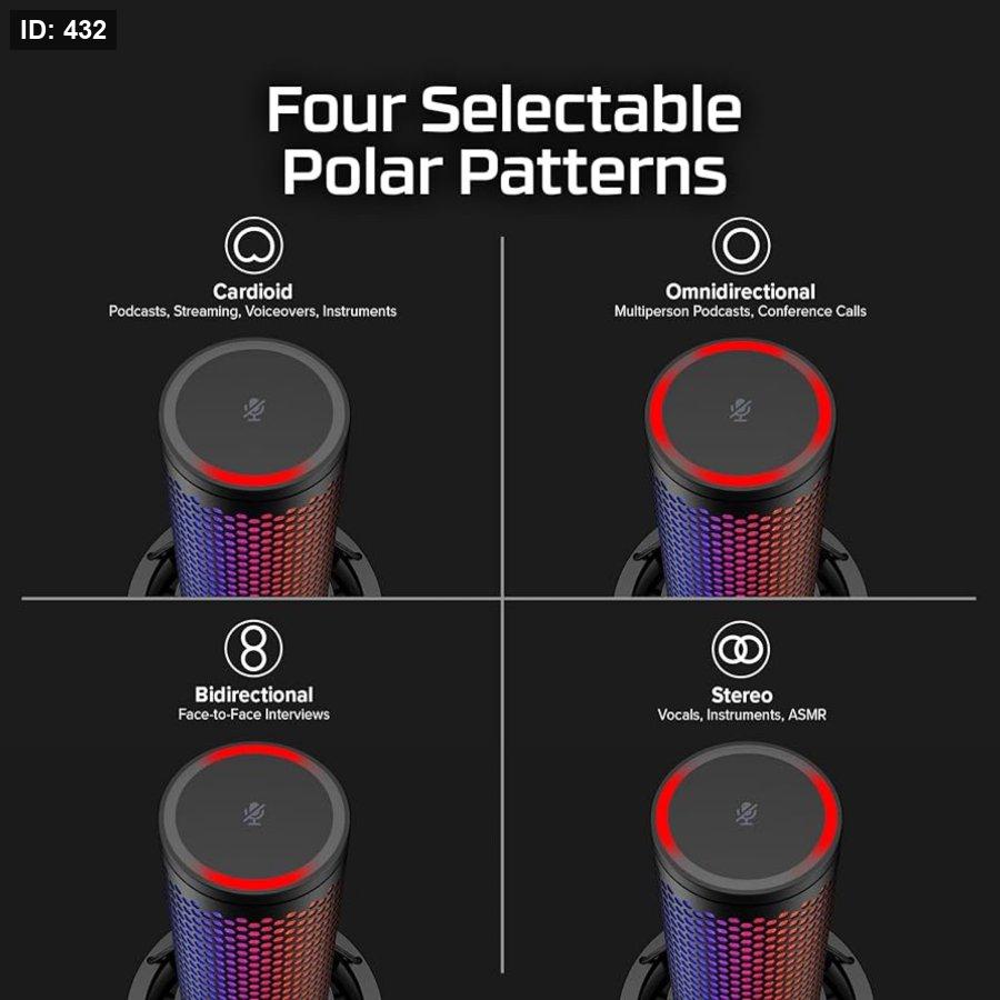 أربعة أنماط قطبية: اختر من بين أنماط ستيريو وثنائي الاتجاه وأحادي الاتجاه وقلبي لتُحسين التسجيل لمختلف المواقف، سواء كان ذلك بثًا منفردًا أو بودكاست جماعي أو تسجيل آلات موسيقية. [صورة لأنماط قطبية لميكروفون HyperX QuadCast S RGB - أسود]