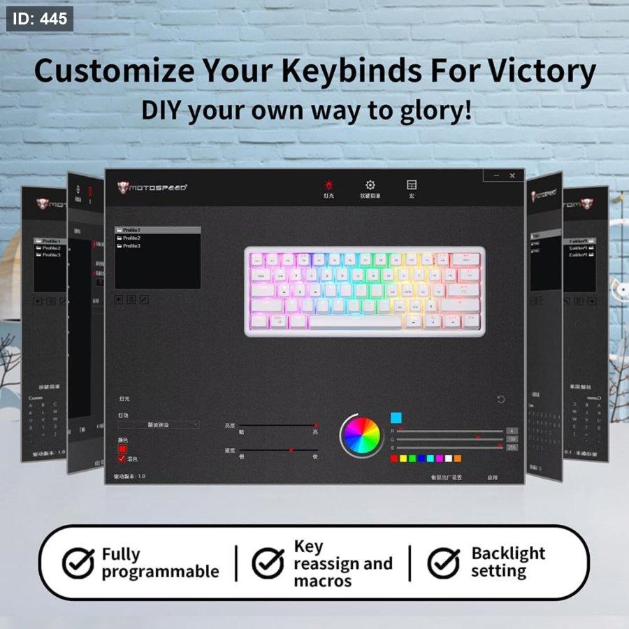 The Motospeed SK66 has a solid plastic chassis with double-shot ABS or PBT keycaps, providing durability while maintaining a lightweight feel. The build quality is generally good for a budget keyboard.