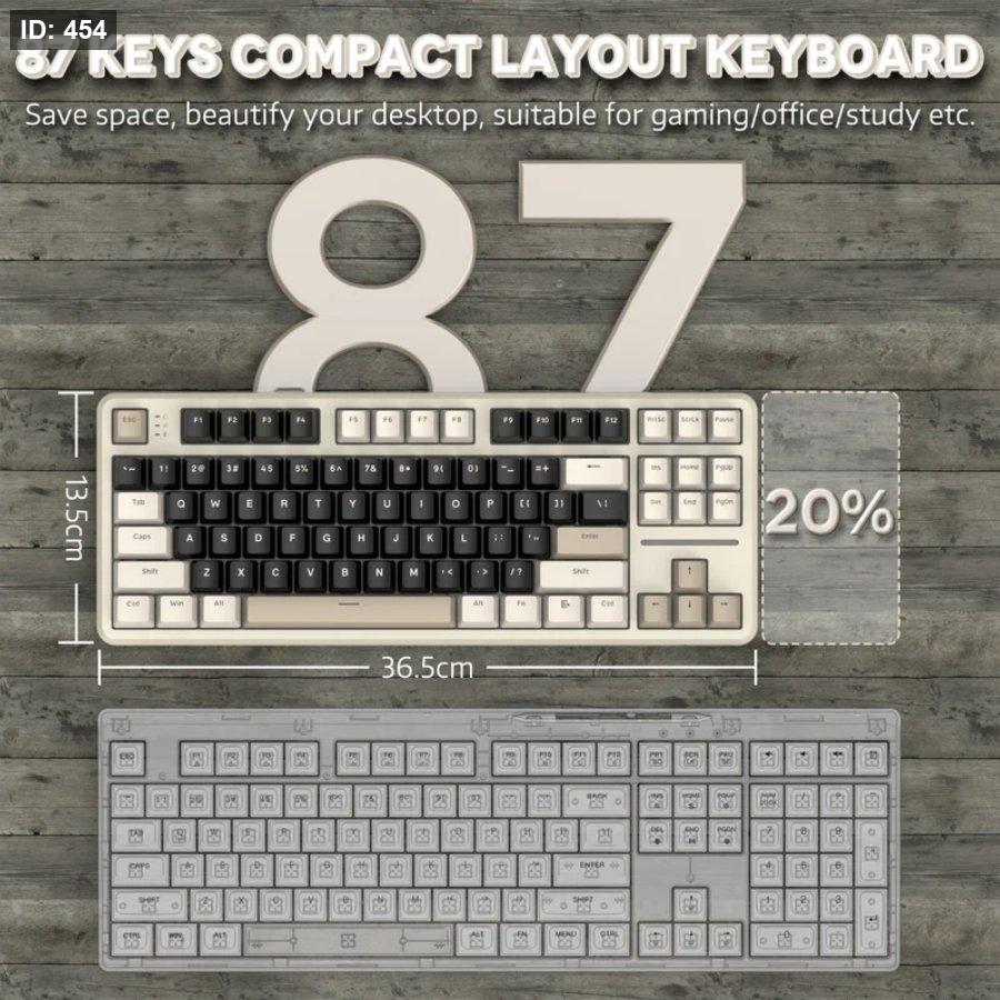 Compact 87-key ANSI layout, Mac/Win compatibility via easily toggled modes .
