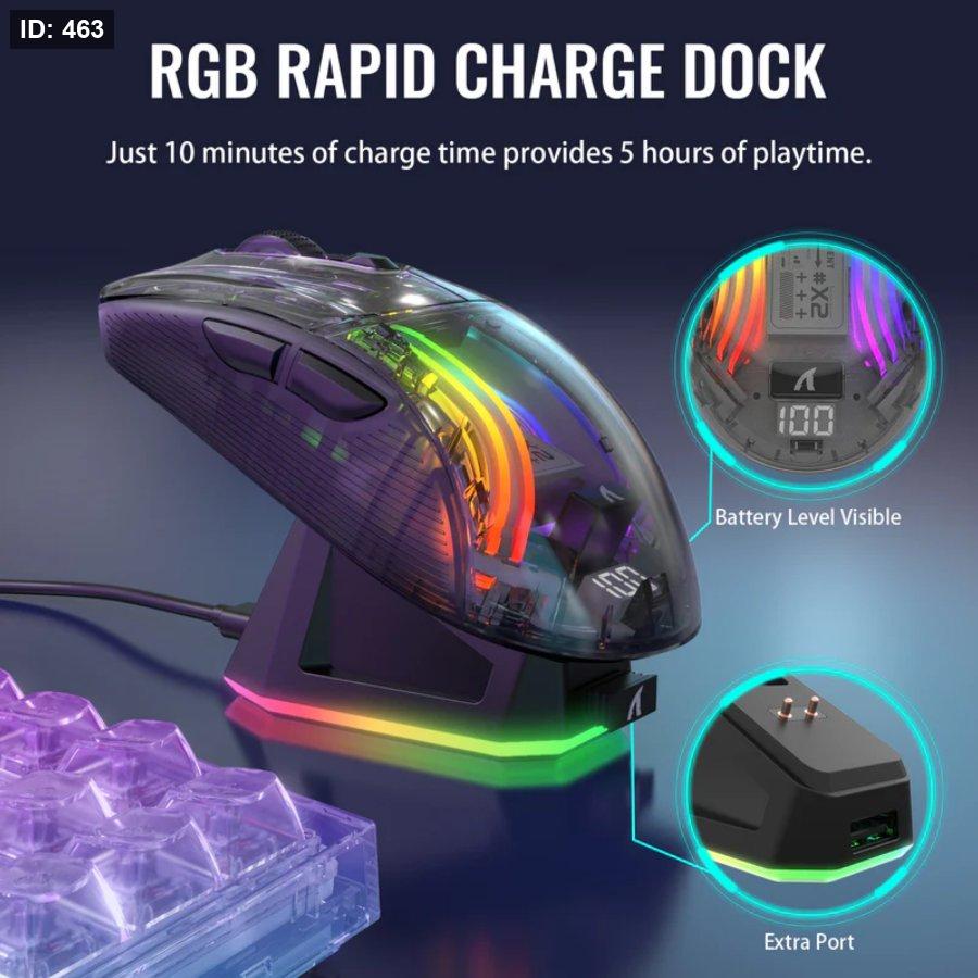 Charging dock: Magnetic quick-charging base—10 minutes gives ~5 hours runtime; dock is RGB backlit and allows color customization
