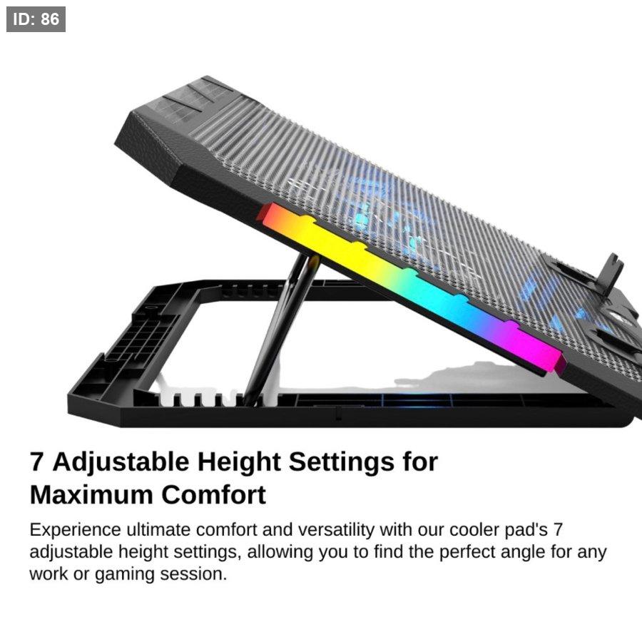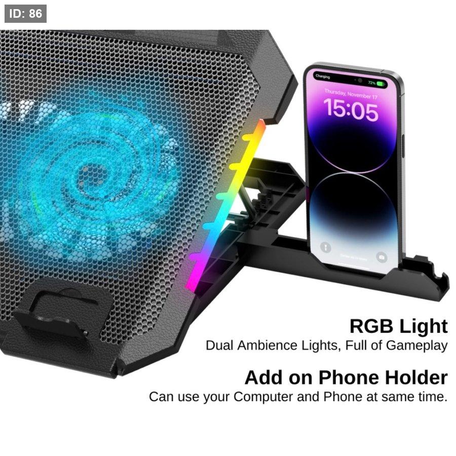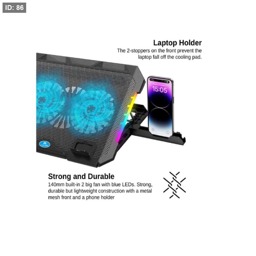 هي قاعدة تبريد مصممة لتحسين أداء أجهزة الكمبيوتر المحمولة، خاصةً أثناء الاستخدام المكثف أو ممارسة الألعاب. تتميز بتصميمها مع مروحتين قويتين وهادئتين، وهيكل خفيف ومتين مع سطح شبكي معدني يوفر تهوية جيدة. كما أنها قابلة للتعديل لزاوية مريحة وتتضمن إضاءة LED زرقاء.